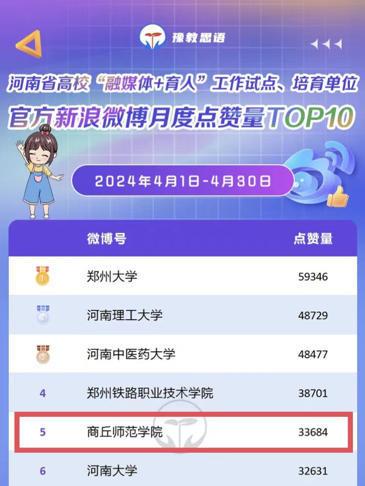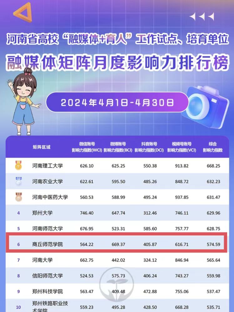 近日,在河南省教育厅“豫教思语”微信公众号发布的河南省高校“融媒体+育人”工作试点单位、培育单位融媒体矩阵4月份影响力(WCI、BCI、DCI、VCI)排行榜中,对融媒体矩阵区域包含的微信、微博、抖音、视频号进行综合考量和评价。数据显示,新2会员官网4月份融媒体矩阵影响力指数574.59,位居河南省高校榜单第6名。其中,官方微博月度排行榜,位居河南省高校第3名。