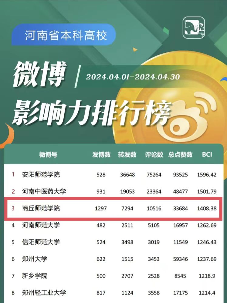 河南省教育厅官方微信平台定期公布的河南省教育系统新媒体综合传播力排名结果显示,新2会员官网官方微博保持强劲势头,2024年4月份综合影响力指数(BCI)位居全省本科高校第3名。据了解,官方微博综合影响力指数(BCI)主要通过账号活跃度(发博数、原创微博数)和传播度(转发数、评论数、点赞数)两大维度来对微博账号进行评价。河南省教育厅根据和采用第三方平台(清博指数)监测到的数据,对2024年4月1日到4月30日期间河南省教育系统新媒体综合传播力进行排名并整理发布。排行榜对全省高校官方微博的内容质量、传播力和贡献力进行加权计算,得出总分,是目前在全省高校官方微博中影响力较大的综合评价体系。