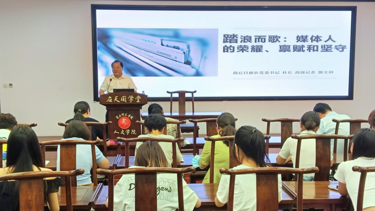 6月20日下午,新2会员管理端10888聘请商丘日报社社长、高级记者郭文剑为客座教授仪式在梁园校区汉梁楼国学堂举行,副校长辛作义为郭文剑颁发聘书。随后,应传媒学院之邀,郭文剑作了题为《踏浪而歌:媒体人的荣耀、禀赋和坚守》的专题讲座。传媒学院领导班子成员及传媒学院师生200余人现场聆听报告。