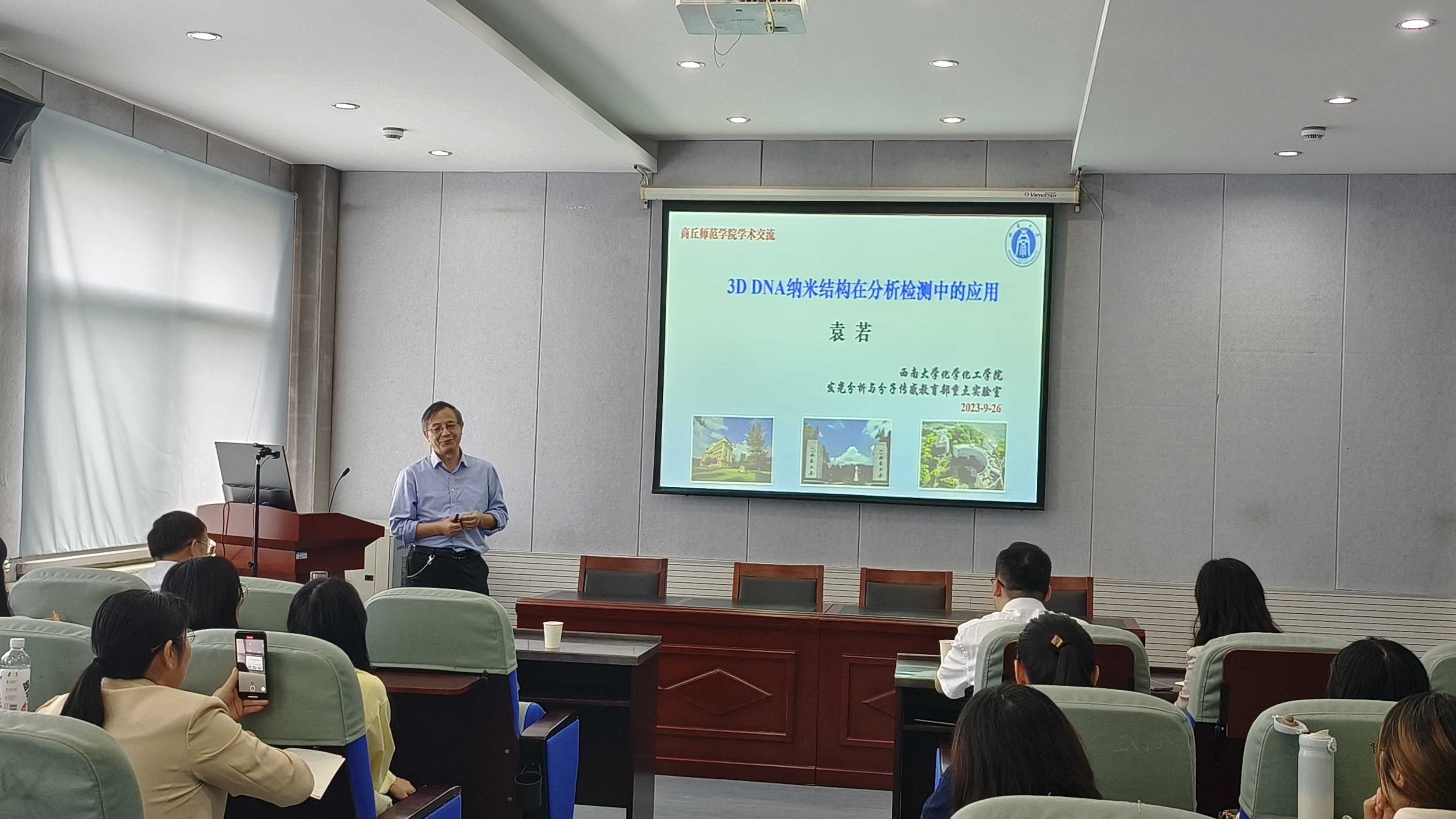 9月26日,应化学化工学院邀请,西南大学袁若教授在新2会员官网睢阳校区化学实验楼311报告厅作了题为《3D DNA纳米结构在分析检测中的应用》的学术报告。报告会由化学化工学院院长张银堂主持,河南省生物分子识别与传感重点实验室主任徐茂田教授、学院部分教师、研究生及本科生参加。
