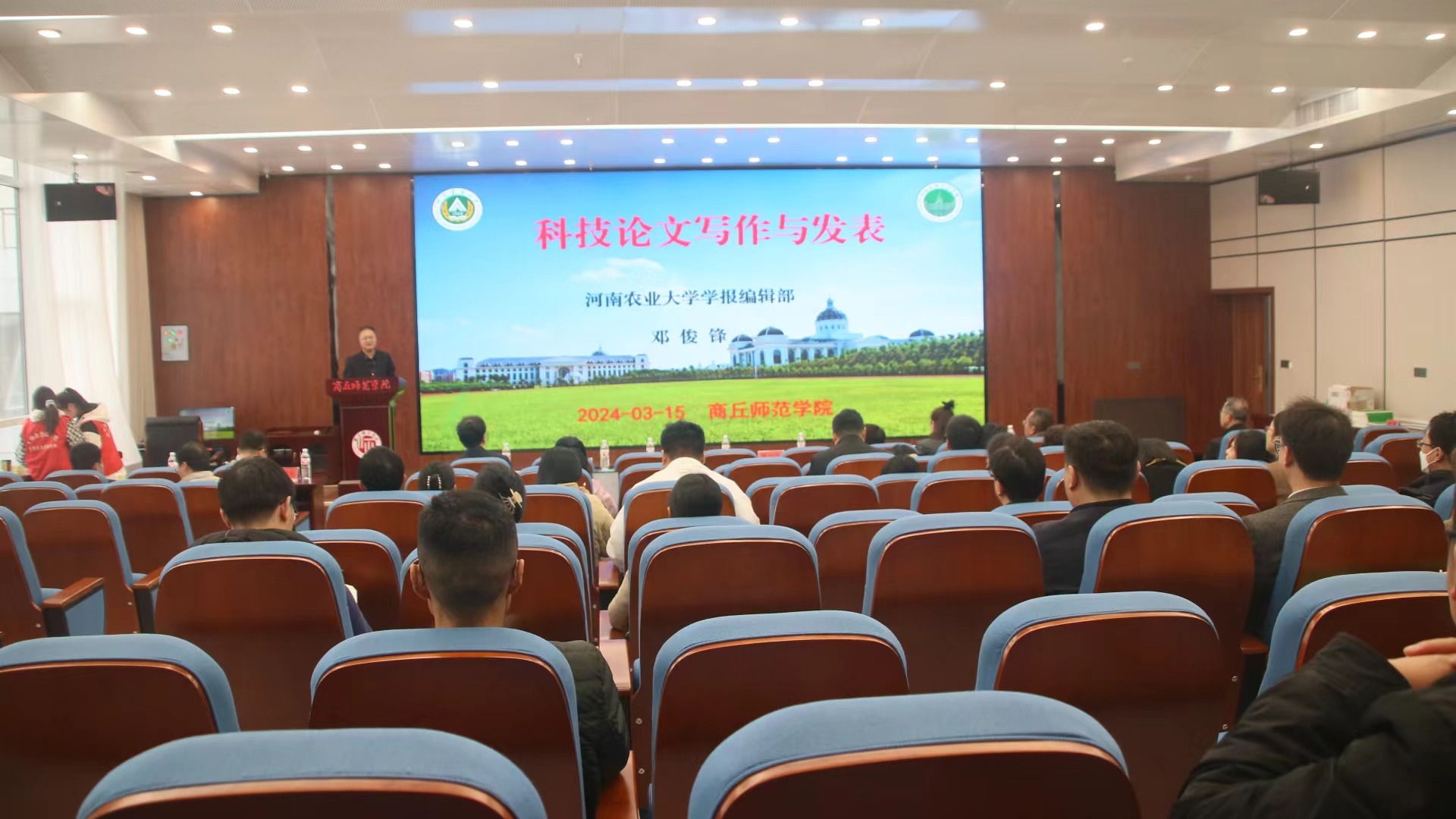 3月15日,河南农业大学学报编辑部主任邓俊锋教授在新2会员官网睢阳校区实训大楼二楼会议室,做了题为“高水平科技论文的写作与发表规范”的学术报告。生物与学院院长周庆峰主持报告会。