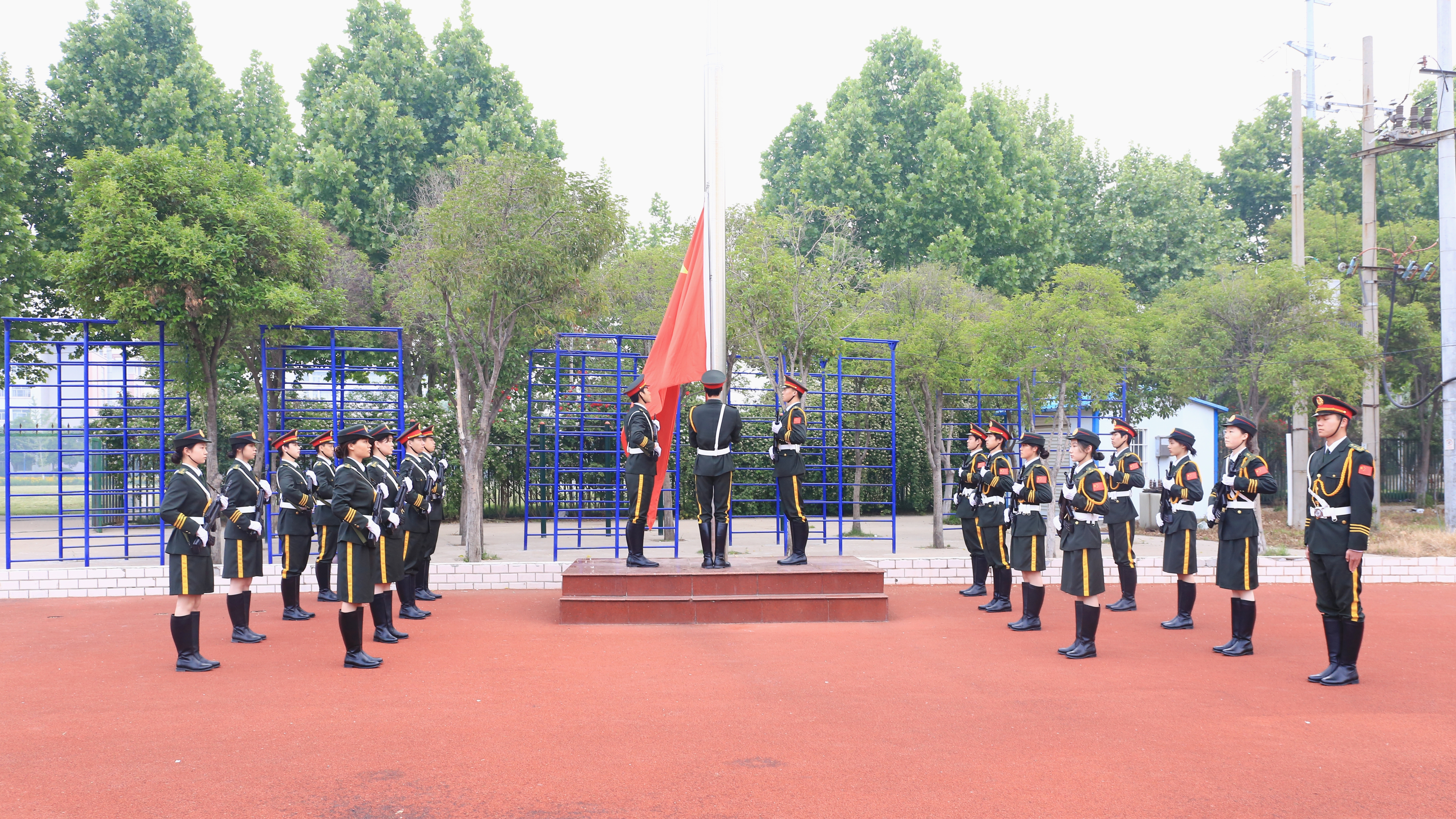 红日初升,国旗仪仗队步履铿锵。鲜艳的五星红旗在庄严的国歌声中冉冉升起,全体师生列队肃立、高唱国歌,向国旗行注目礼。